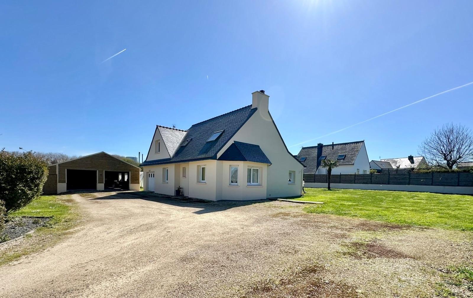 PLOUGUERNEAU, à environ 800 mètres à pied du bourg et de la plage Kréac'h an Avel. Belle traditionnelle T6 de 2002 posée, au calme sur un terrain clos de plus de 1300m2.